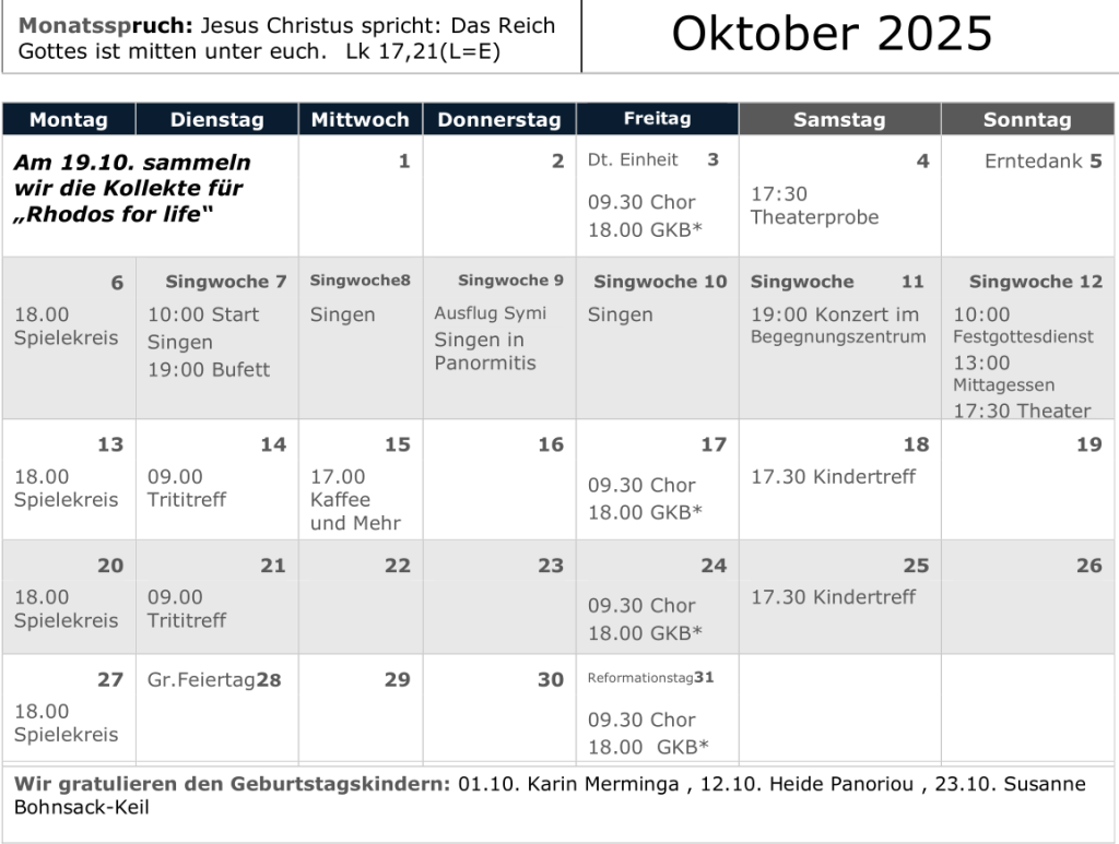 Und jetzt: Rhodos. Diesmal für länger.Im September beginnt mein zehnmonatiger Dienst in der Gemeinde.Ich freue mich, das Leben hier als Seelsorgerin mitzugestalten: im Hören auf die biblischen Texte, im gemeinsamen Feiern, im Singen, in offenen Gesprächen über die Themen, die uns das Leben aufgibt. In der Hoffnung, dass