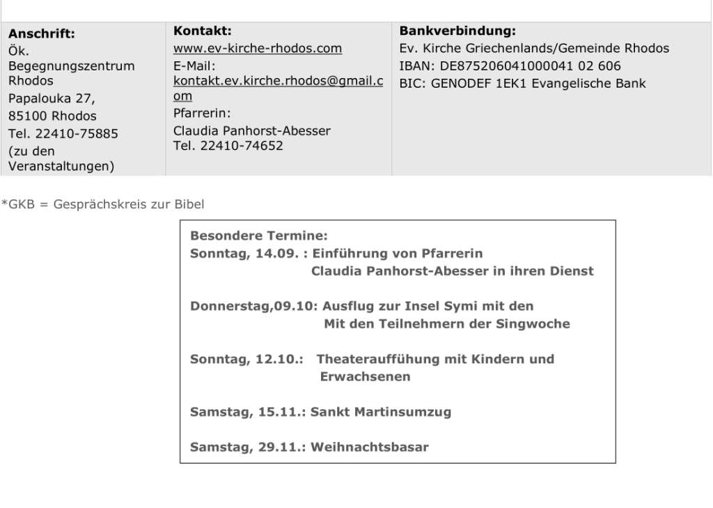 Richtigstellung: In unserem Gemeindebrief Juni–August berichteten wir auf Seite 4 über die Teilnahme der deutschsprachigen Gemeinden in Griechenland am Kirchentag in Hannover.Am Stand war auch der Förderverein Agios Andreas